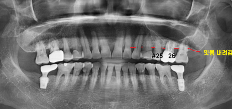잇몸이 전반적으로 내려간 풍치가 발견되었습니다.